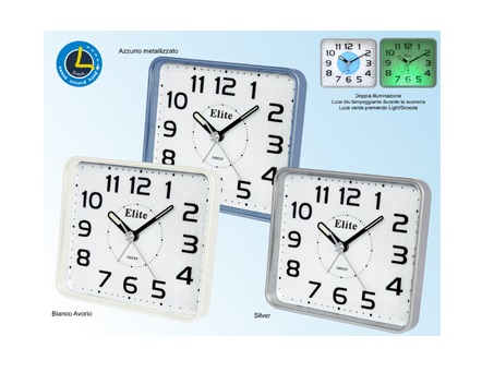 Cassa In Plastica – 75 X 75 Mm Colori:Bianca – Azzurra – Silver, Quadrante Luce Azzurra Funzione Base:Sveglia Al Quarzo, Illuminazione Speciale Caratteristiche Aggiuntive: Luce E Ripetizione Suoneria: Beep