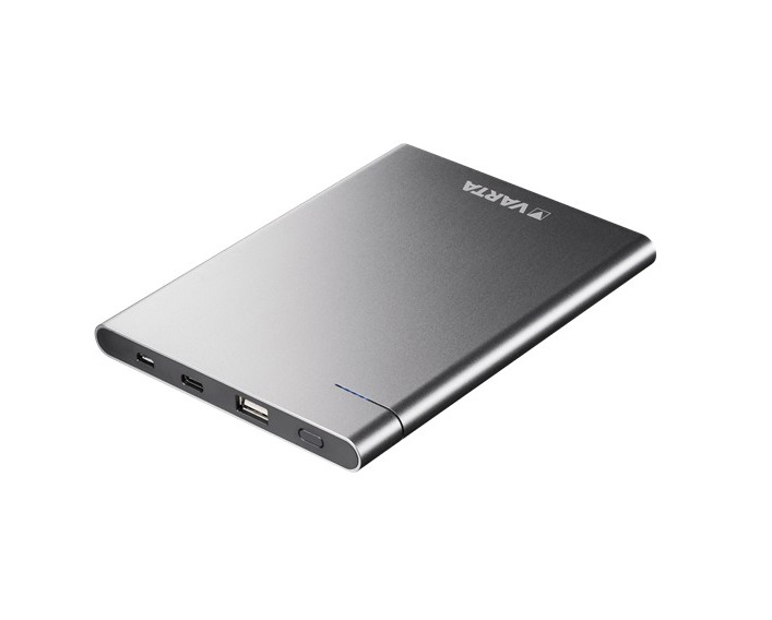 PANORAMICA Power Bank sottile con batteria 12000 mAh Li-Po per i weekend Fino a 5 ricariche per il cellulare e 2 per il tablet* Ideale per ricaricare 2 dispositivi in contemporanea Uscita USB tipo C 5V/3.0A per ricarica rapida Uscita USB 5V/2.4A per ricaricare tablet o altri dispositivi di più grandi dimensioni 4 sofisticati LED blu per indicare il livello di carica & scarica Cavo di ricarica micro USB nero con una lunghezza di 50 cm in dotazione Rivestimento in alluminio, elegante e sottile Qualità assicurata dal marchio VARTA DETTAGLI Tipo 57966 Sistema Elettrochimico Li-Po Capacità della batteria in mAh 12000/ 3,7V Capacità stimata in mAh 7104/ 5V Larghezza 115 mm Altezza 153 mm Profondità 13 mm Peso 390 g